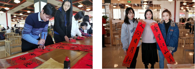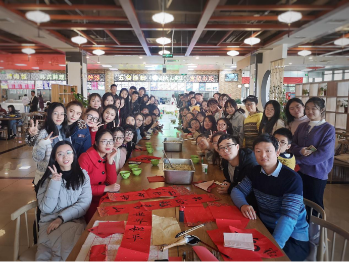 灯谜环节结束后,心灵手巧的同学们开始写对联、剪窗花。大家互送对联,希望将美好的祝福传递下去。大家共剪窗花,共话友谊,将一份新年的喜气带到了活动现场。尽管是寒冷的十二月,但同学间的深厚友谊却温暖人心。