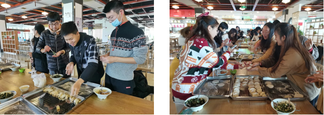 饺子是冬至的传统美食,各地都有不同的包法。活动一开始,大家就动起手来包饺子,并相互介绍着自己家乡饺子的特点,空气中充满了快活的气息。不会包饺子的同学在其他同学的帮助下也开始尝试动手包饺子。苏州的同学带来了桂香满溢的冬酿酒邀请大家品尝,并向大家介绍了苏州特有冬至习俗。大家身体力行,体味着劳动的快乐。