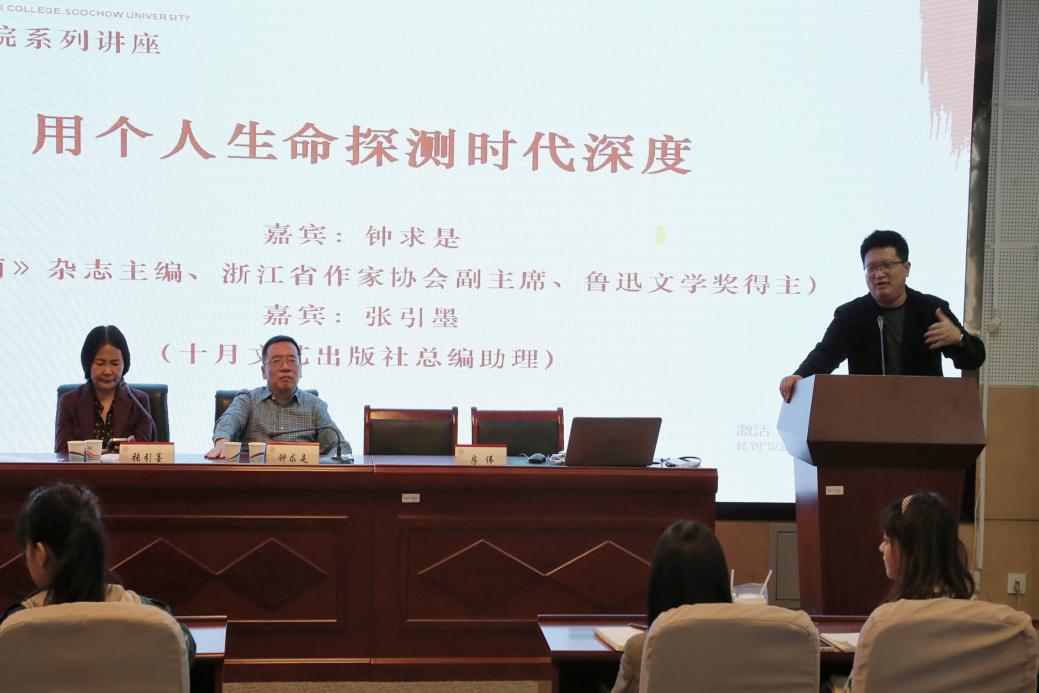 2023年3月11日上午九点,《江南》杂志主编、浙江省作家协会副主席、鲁迅文学奖得主钟求是老师和十月文艺出版社总编助理张引墨老师应邀来到苏州大学为唐文治书院学子开展了一场以“用个人生命探测时代深度”为主题的讲座。