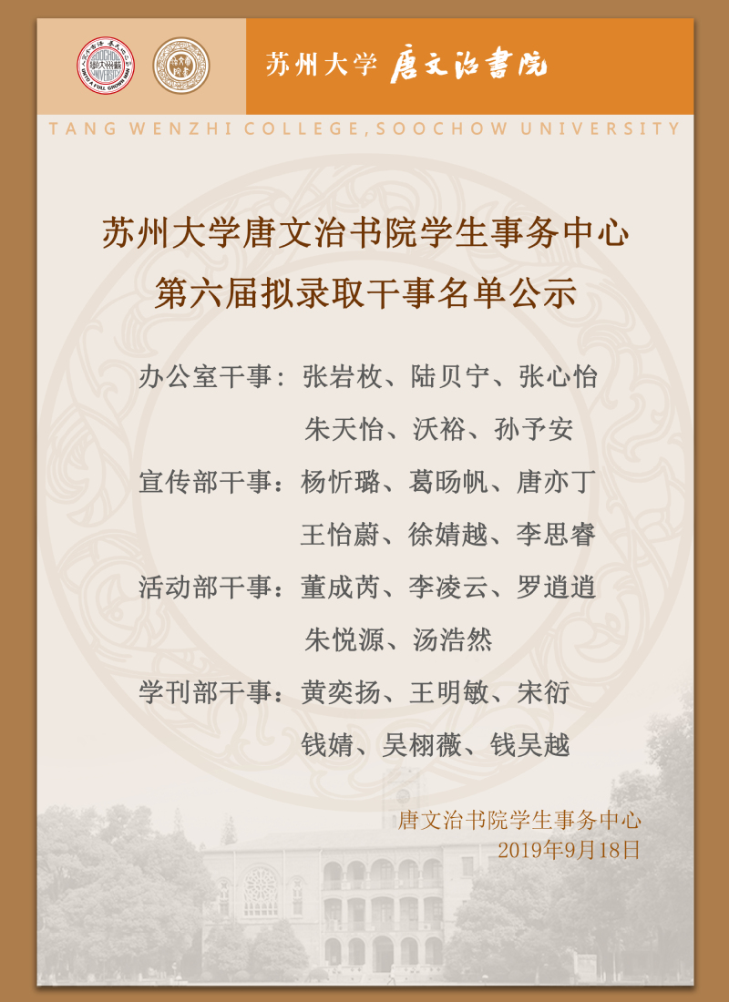 苏州大学唐文治书院学生事务中心第六届拟录取干事名单公示