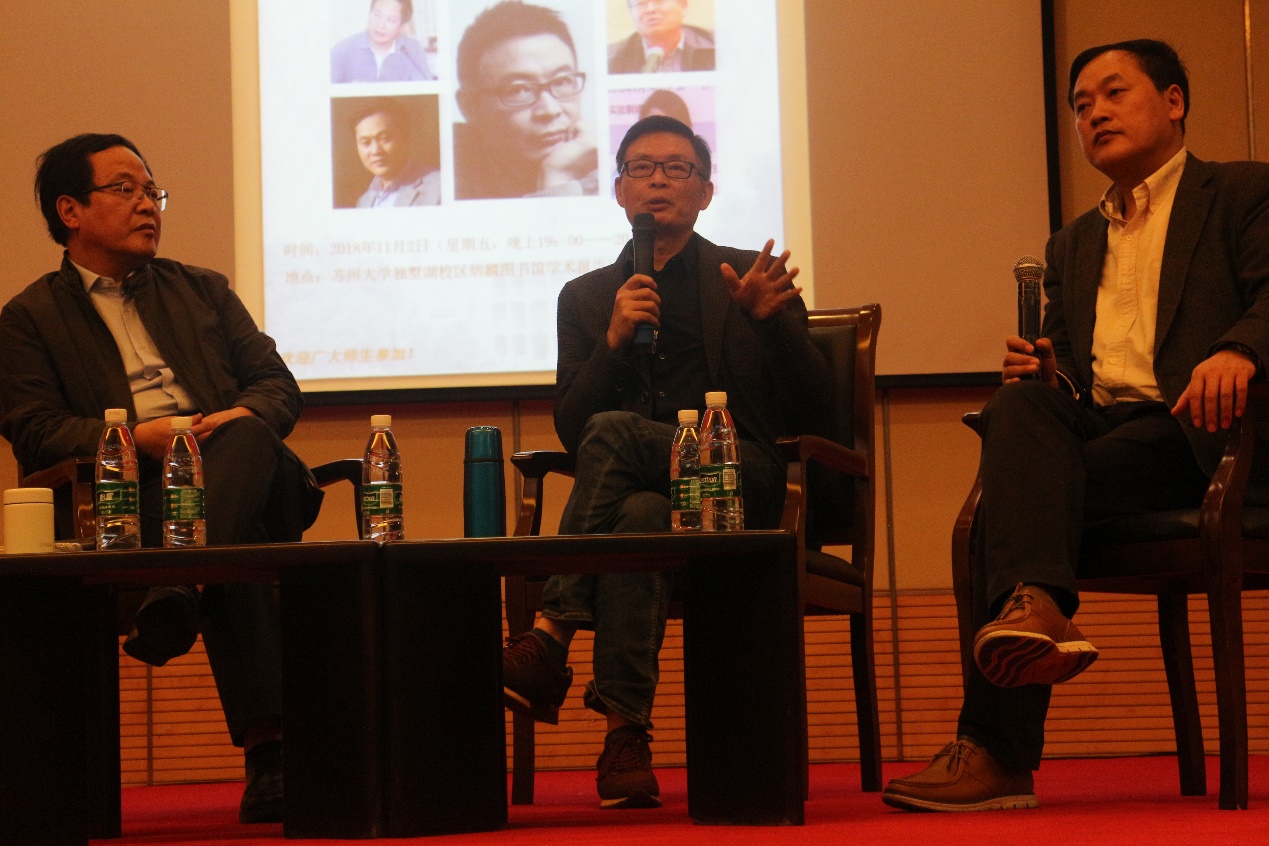 2018年11月2日星期五,在苏州大学独墅湖校区炳麟图书馆的学术报告厅,我们有幸请到了著名作家,编剧,被誉为“谍战小说之王”的麦家先生,以及著名评论家吉林省作协主席张未民先生、中山大学教授谢有顺先生以及《人民日报》文艺部主任刘琼女士为座谈嘉宾,开展了一场别开生面的、围绕麦家个人经历及其作品的座谈会。