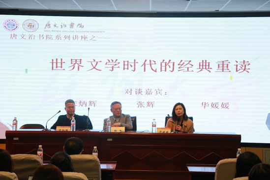 11月6日晚六点,北京大学教授张辉、上海外国语大学教授宋炳辉和大连外国语大学教授华媛媛三位对谈嘉宾为同学们带来了“世界文学时代的经典重读”的讲座。本次讲座由季进老师主持,唐文治书院全体同学参加。