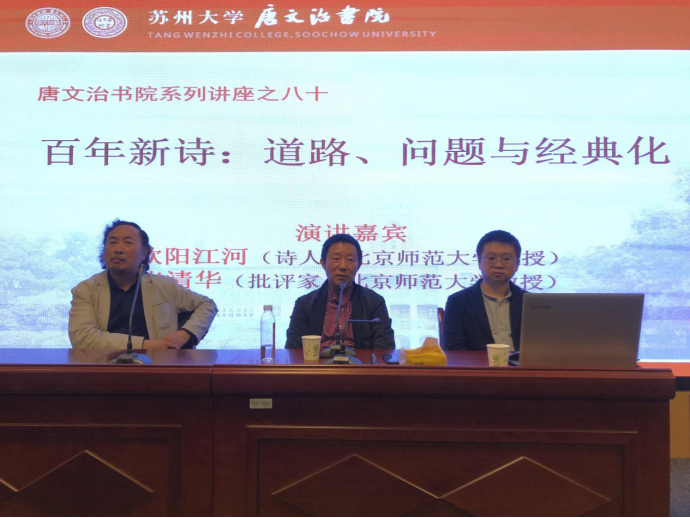 张清华教授指出新诗百年历史中诞生了许多优秀的诗人及作品,并以欧阳江河教授的诗篇《玻璃工厂》为例,借由其体现的诗歌、语言的诞生,从无到有,从晦暗到自明的思想,指出新诗是将社会、历史等问题上升到哲学层面,处理一个时代总体性命题。随后张教授将海子的《以梦为马》、李白的《将进酒》及屈原的《离骚》联系分析,并且引用罗兰·巴特在评价诗人与诗歌作用时所说,“在莎士比亚、但丁和歌德诞生的时候,英语、意大利语和德语是一个样子,等到他们谢世的时候,又变成了另外一个样子 ”,指出现代语言已经成为了一种伟大的语言,诗人负担的使命就是让其民族的语言更具表现力,更具令人崇仰的、神奇的魅力。