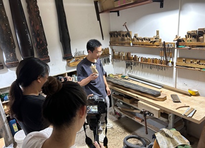 之后,顾老师带大家参观了他的制琴室。琳琅满目的工具让人眼花缭乱,每一把上都残留着长期使用过的痕迹,仿佛记录了制琴的不易,大家纷纷为制琴的匠心惊艳不已。顾老师还拿出多张古琴的拓片为团队成员讲解明琴与清琴、官琴与民琴之间的关系,大家给顾老师赠送纪念品并合影留念。做琴过程中独特的传统美学与顾老师以传承为本的做琴态度让成员们都敬仰不已。