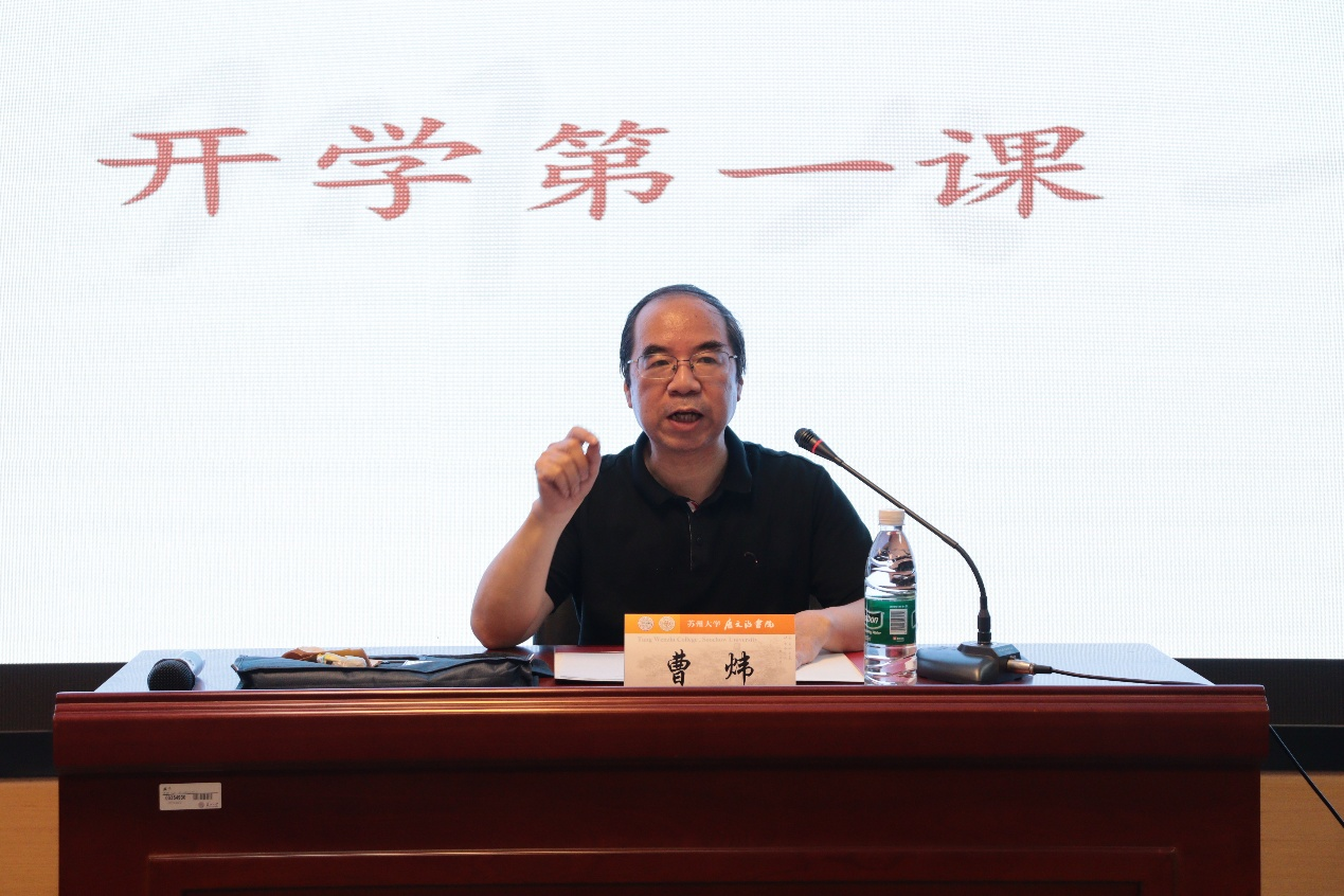 在致辞环节结束后,出席开学典礼的各位老师与2025级至诚班全体新生一起合影留念。合影环节结束后,曹炜老师为新生讲授“开学第一课”。课上,他结合书院文史哲贯通的培养模式,介绍了唐文治书院的历史渊源与办学初衷,深刻阐明了书院学子传承文化、深耕学术的时代责任。他结合个人求学治学经历,以风趣幽默的语言激发新生对大学学术生活的向往与热情,勉励新生以积极姿态融入书院学习与学术实践,并针对大学生活中可能面临的学业规划、心理调适等问题作了细致阐释与针对性指导。曹炜院长的“开学第一课”高屋建瓴,为新生明晰学术路径、锚定成长方向提供了重要指引。
