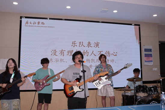 校园乐队“哭泣玫瑰”带来摇滚乐《没有理想的人不伤心》,激昂澎湃的乐声、饱含力量的歌词传递出深刻的哲理,将晚会的气氛推向高潮,赢得在场同学的一致喝彩。在随后的即兴表演环节中,话筒在同学们之间有序传递。王天逸、平禾勰、梁锦睿、徐豪、彭文韬等同学先后登台演唱,取得了热烈反响,现场氛围持续活跃。