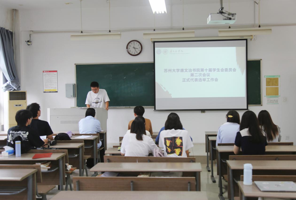 2023年9月25日上午10时,苏州大学唐文治书院于苏州大学独墅湖校区南区文综楼1002-2304教室召开第十届学生会委员会第二次会议,选举产生苏州大学第三十六届学生代表大会正式代表。本次会议由唐文治书院学生事务中心主席何冰雁同学主持。