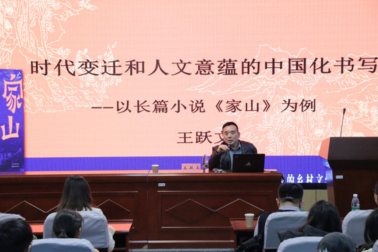 讲座伊始,王跃文先生指出:创作中国小说、讲述中国故事、塑造中国人物,最有效的路径是借鉴中国美学经验。为深入阐释这一观点,王跃文先生以鸟、月等中国传统文学典型意象为例,指出中国人与生存空间构建起精神、情感和审美层面的深度联结,在此基础上形成了中国人的宇宙观、世界观、认识论。谈及《家山》的创作动机,王跃文老师表示,作品秉承大历史观,以多维视角书写社会生活史、乡村风俗史、革命斗争史与时代变迁史,旨在讴歌中国传统文化之美、民族根性之美与文明进步之美,塑造可信、可爱、可敬的中国人形象。