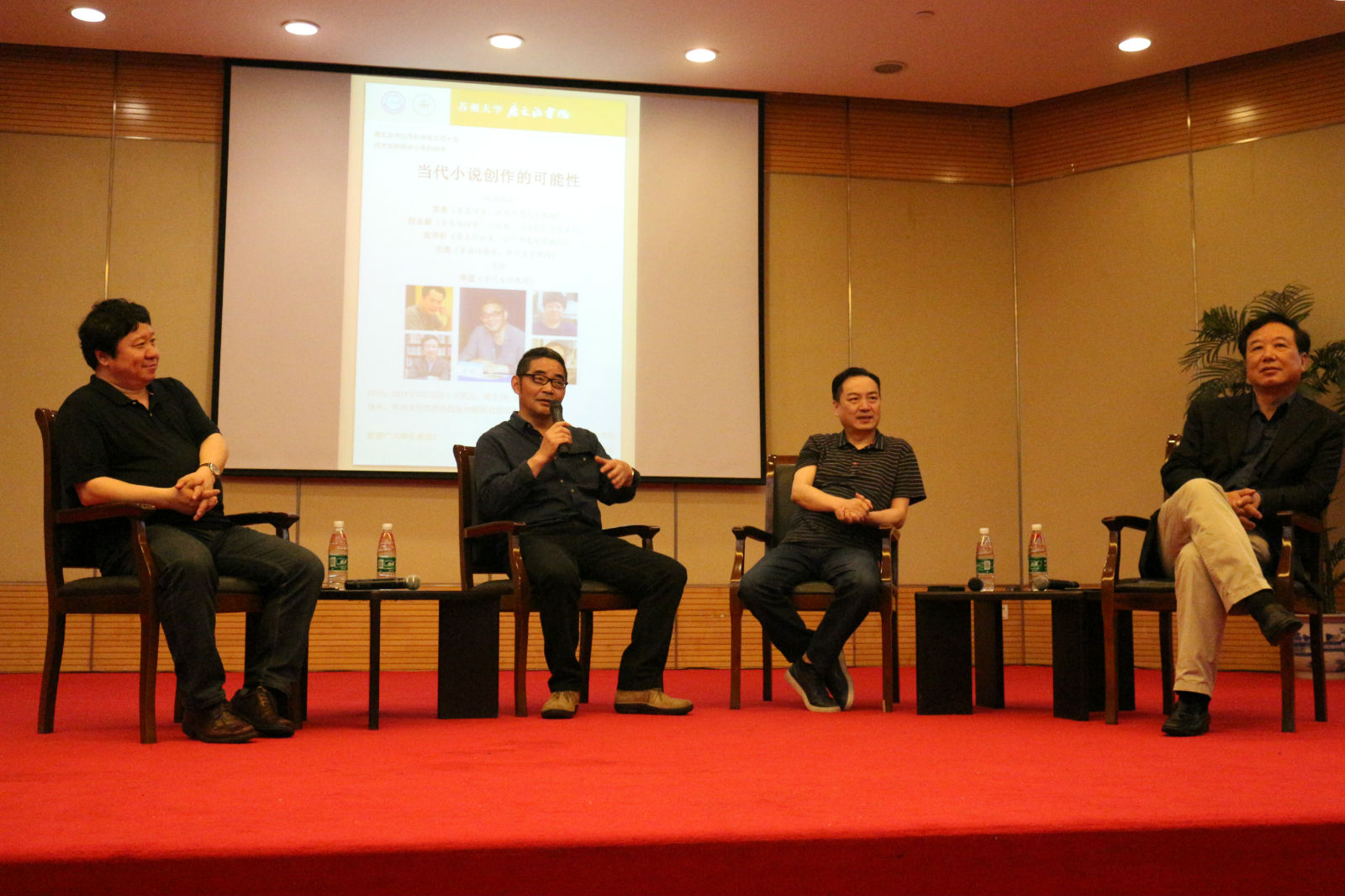 525日晚,在全校师生的热切期盼中,“当代小说创作的可能性”讲座在炳麟图书馆学术报告厅如期举行。北京师范大学教授、当代著名作家苏童先生,著名编辑家、小说家、《收获》杂志主编程永新先生以及辽宁师范大学教授、著名评论家张学昕先生受邀莅临苏州大学,并与唐文治书院院长、著名评论家王尧教授以对谈的形式探讨当代小说创作的可能性。本次讲座由唐文治书院常务副院长,著名学者季进教授主持。