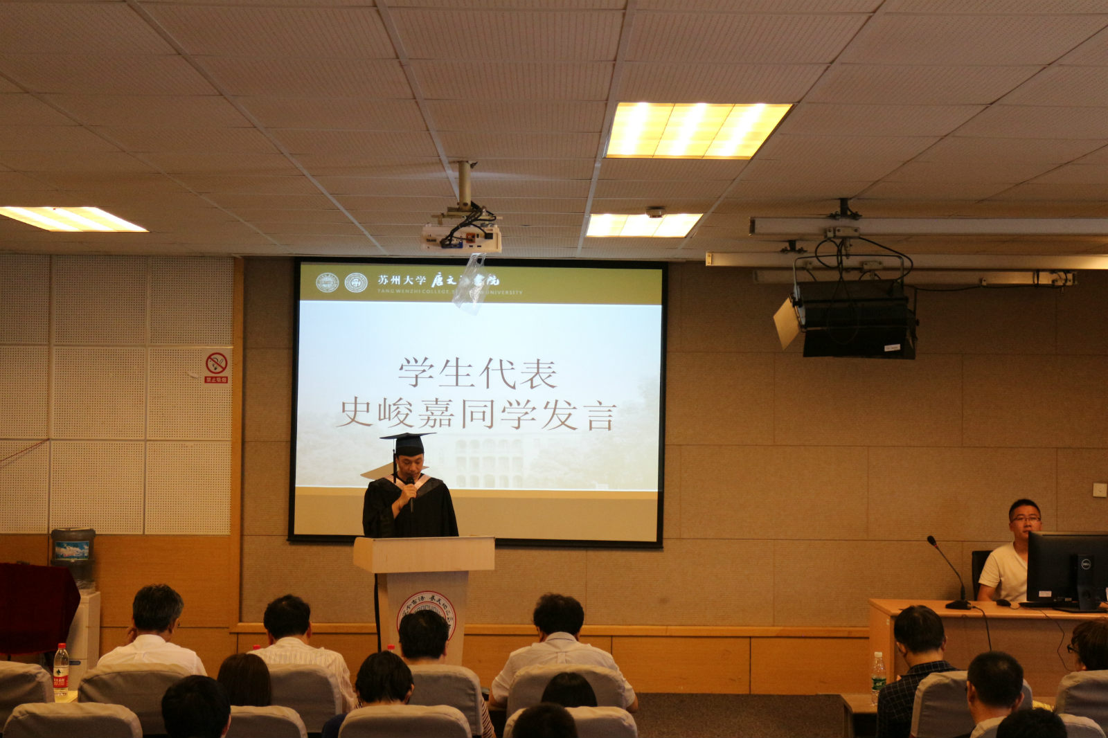 典礼第三项,毕业生代表史俊嘉同学进行发言,他回顾了在书院的学习历程,回忆初进入书院时迎接的新挑战,广而精的课程设置让人受益匪浅。在期中周写论文,忙碌又充实;文化考察趣味无穷,收获知识,在读万卷书的同时,行万里路,诸多记忆回味无穷。四年的光阴而白驹过隙,恰同学少年意气风发,四年的共同回忆是同学们的宝贵财富。最后史俊嘉同学代表全体毕业生向诸位老师表达感谢,18届书院同学取得的可喜荣誉和“优秀班集体”称号都离不开书院导师的指导,同时祝愿各位同学不忘初心,诸事顺利。