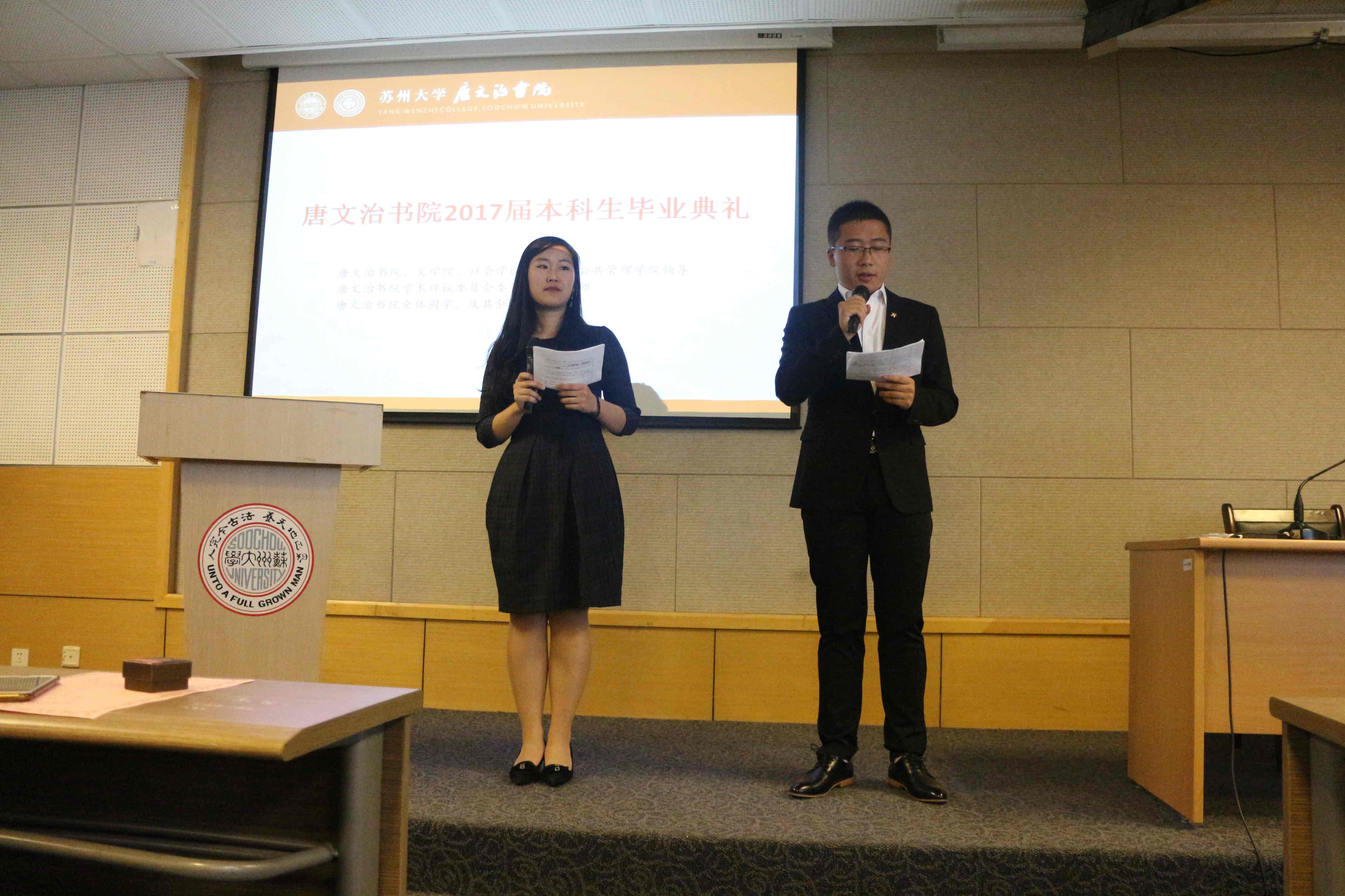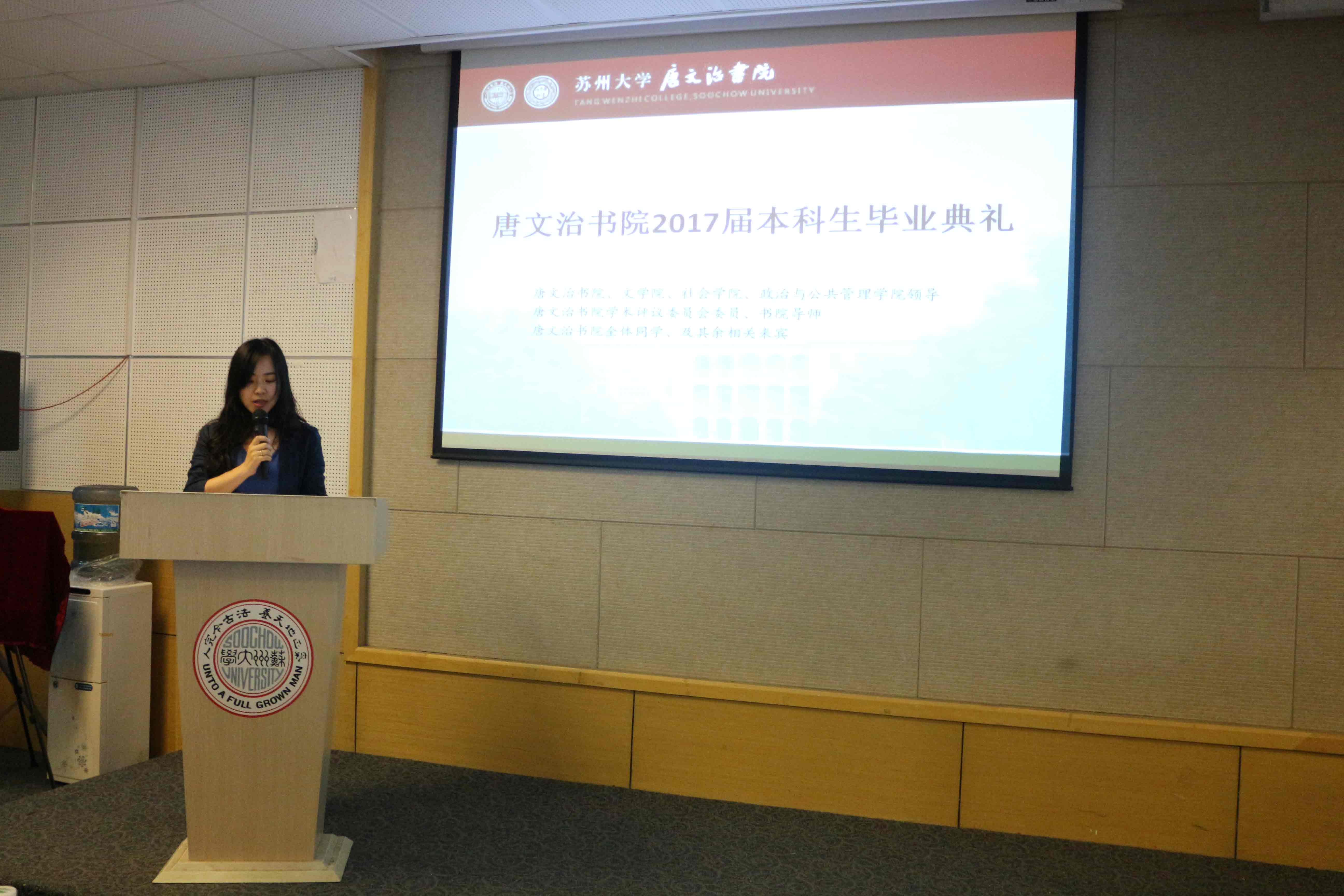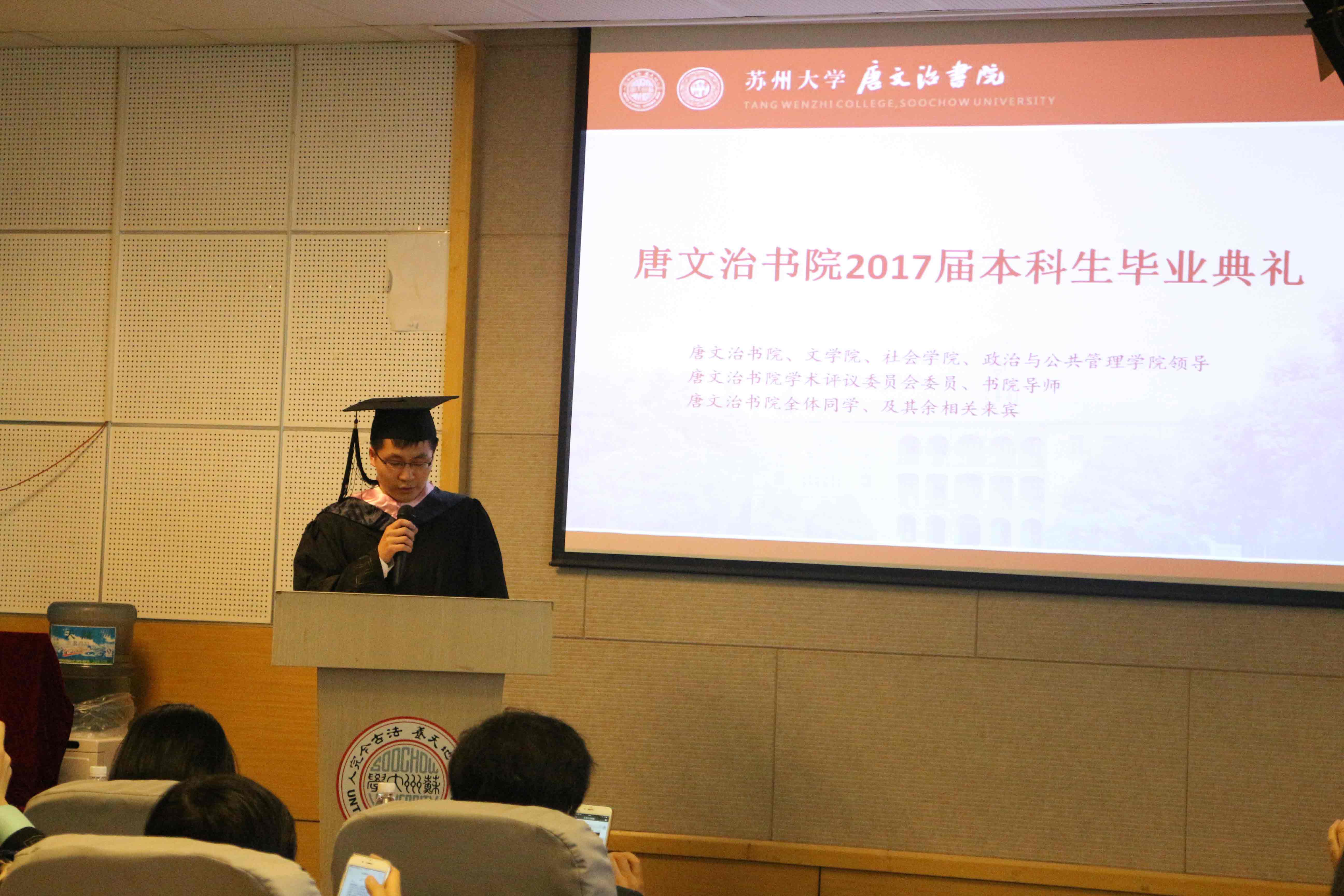 随后,毕业生代表潘伟峰同学发言。他回顾了四年的书院生活,在书院打通文史哲,学贯中西的教育模式,在强劲的师资力量和班级良好的学习氛围当中,同学们竞争合作,共同促进了彼此的成长。同时,潘伟峰同学也代表2017届毕业生表达了对苏州大学的感激以及对书院同学的祝福。