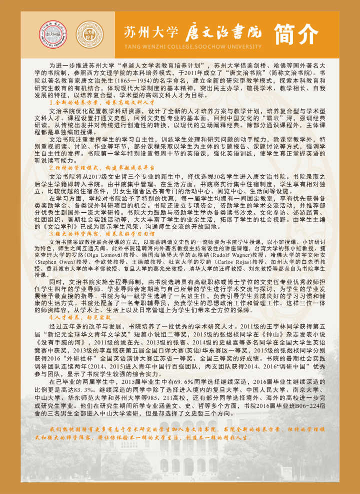 为进一步推进苏州大学“卓越人文学者教育培养计划”,苏州大学借鉴剑桥、哈佛等国外著名大学的书院制,参照西方文理学院的本科培养模式,于2011年成立了“唐文治书院”(简称文治书院)。书院以著名教育家唐文治先生(1865—1954)的名字命名,建立全新的研究型教学模式,探索本科教育和研究生教育的有机结合,体现现代大学制度的基本精神,突出民主办学、敬畏学术、教学相长、自我发展的特征,以培养复合型、学术型的高端文科人才为目标。