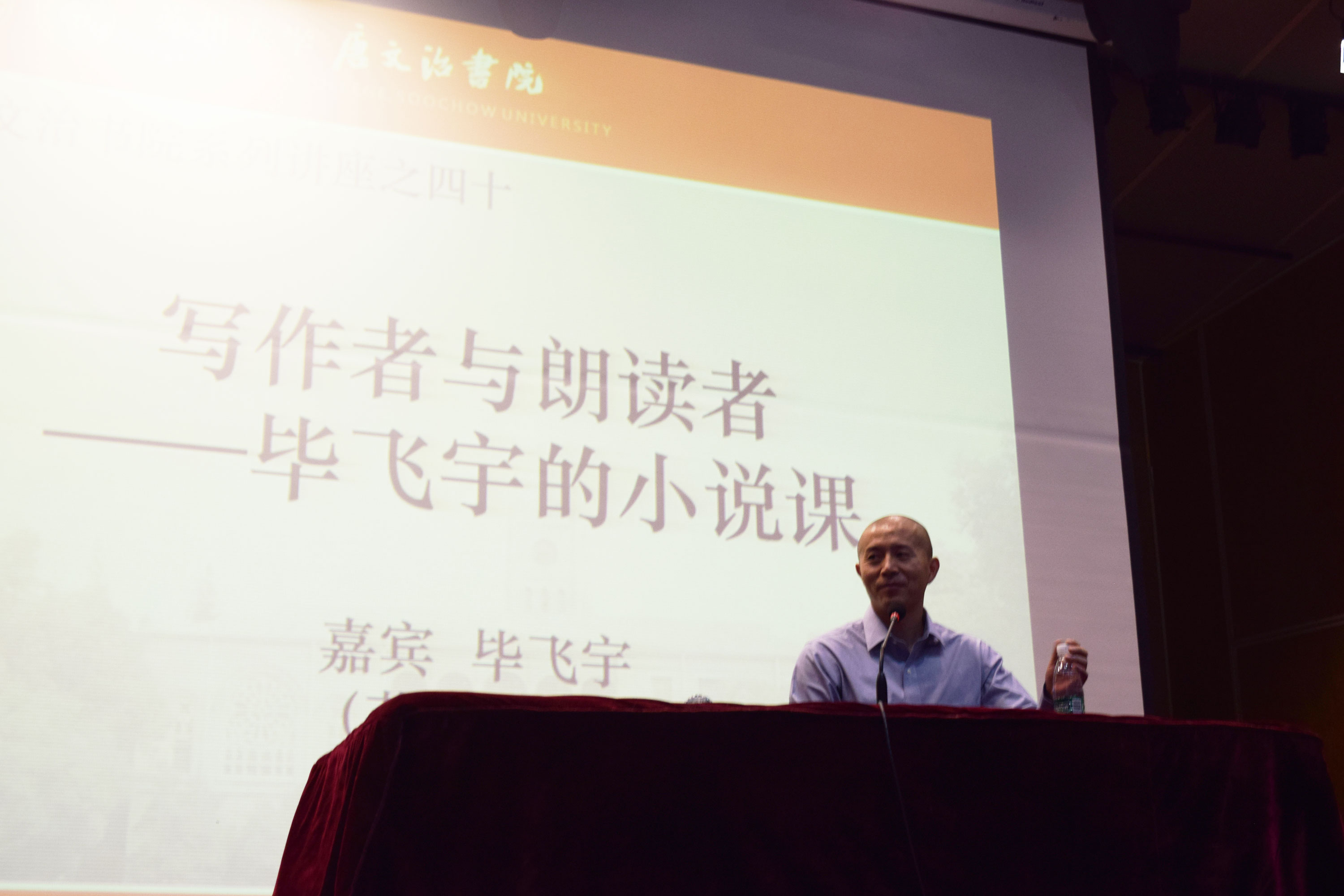 2017年9月16号晚7点,江苏省作家协会副主席,南京大学文学院特聘教授,著名作家毕飞宇老师应苏州大学唐文治书院邀约,莅临苏州大学,于我校601号楼音乐厅成功开展以“写作者与朗读者——毕飞宇的小说课”为题的文学讲座。