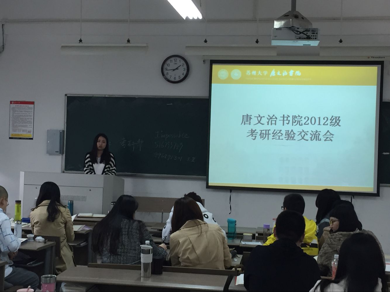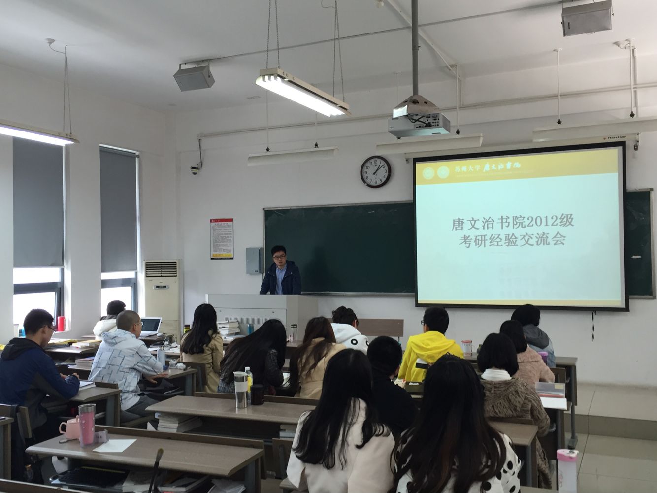 2016年4月27日13时,唐文治书院2012级考研经验交流会在1002-2303教室如期举行。本次交流会由唐文治书院2013级主办,14、15级部分同学也参加了本次交流会。书院2012级学生分享了各自的考研经验,并热情地解答了同学们的问题。