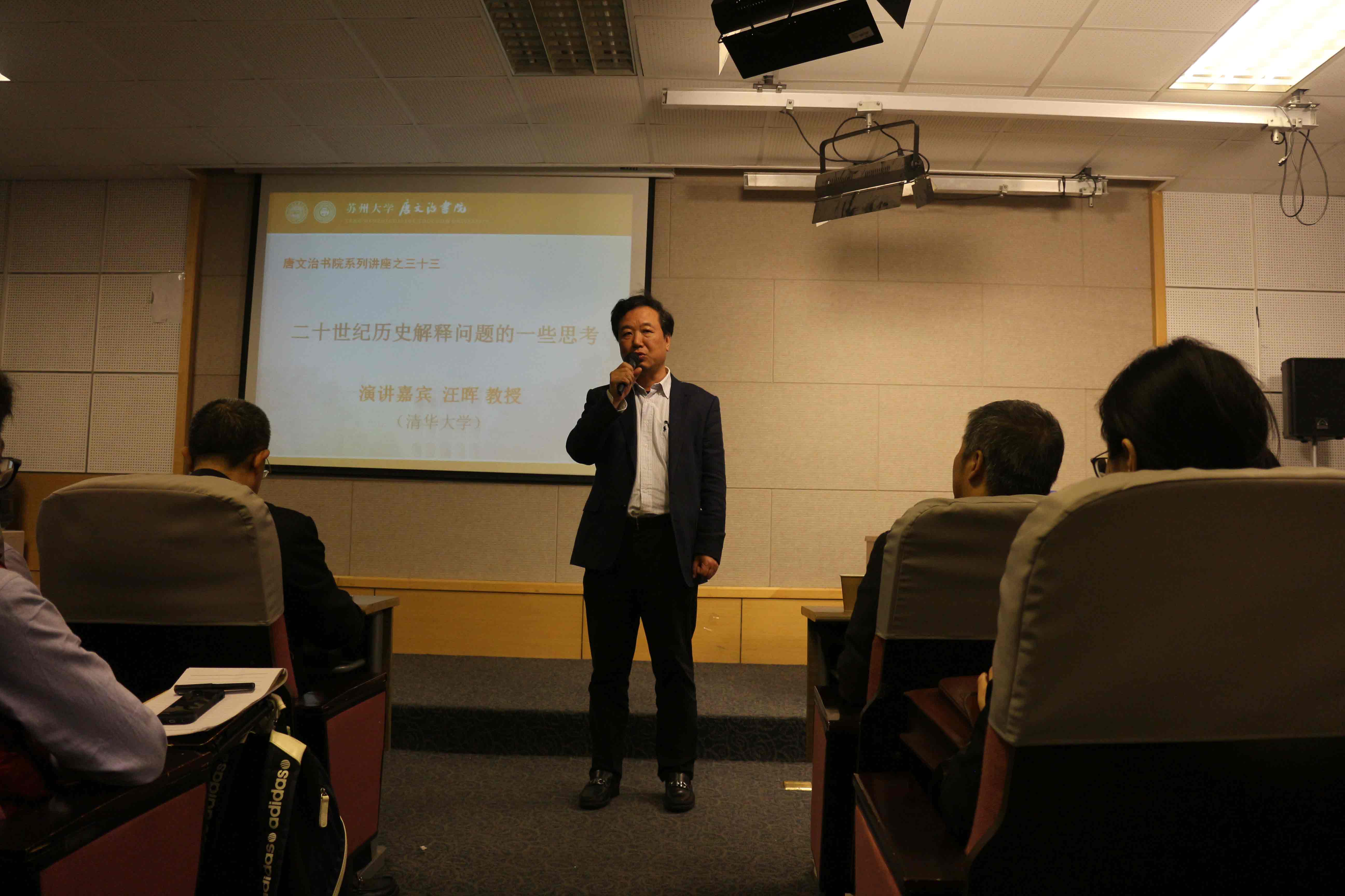 20161114晚,师生济济一堂,享誉海内外的著名学者、清华大学汪晖教授将在苏州大学独墅湖校区1005-5339为唐文治书院系列讲座进行一次讲演。1830分左右,在王尧教授的陪同下,汪晖先生准时步入会厅。在王尧教授简明扼要的介绍下与众人的掌声中,汪教授上台开始了题为《二十世纪历史解释问题的一些思考》的演讲。