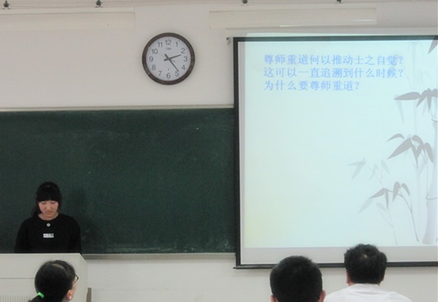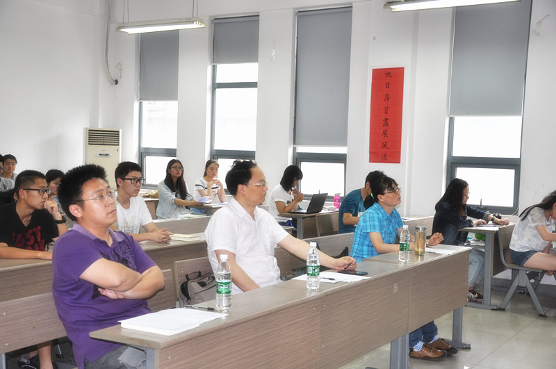 与此同时,在隔壁2304教室中,另外12组选手也在紧锣密鼓地进行着读书报告。第一位上场的是吴家舒同学,她就《儿童的世纪》这本书,从儿童观念的产生为切入口介绍了年鉴派心态史学研究。第二位上场的是金宏和于思瑶团队,她们针对《士与中国文化》一书,详细论述了关于士人的抉择的问题,并在老师点评环节中与朱光磊老师就“士与道”的问题进行了讨论。接下来杨安然同学就《老子道德经校释》一书集中探讨了“美恶之辩何为自然”的问题。她从老子原文和王弼对其的注文入手,深入阐释了老子对于美恶同根,皆和与自然的观点,并生动形象的借用比喻,进一步阐述了对于美恶我们应有的态度。接下来张彩虹和郝云飞同学依次做出了精彩的报告。随后刘佳凯同学以“深入浅出,导夫先路——浅析《汉书艺文志》中道家思想渊源”为主题做出报告,不仅对《汉书艺文志》中考镜道家思想之源流做出了阐发,并且介绍了《艺文志》中目录学之意义作用,及他在历史长河中的影响。七号是来自2013级的段鹏飞,就钱穆先生的《八十忆双亲师友杂忆》论述了《治学亦可兼济天下》的问题,并和评委老师探讨了关于读书与做官的命题。第八个上场的是2013级的潘伟峰,他从《清代地方政府》这本书出发讨论了清代行政体制的僵化及其对当下“简政放权”的现实启示。他深入浅出的讨论和翔实的论述也赢得了在场老师的肯定。随后,王小羽、花晓雅、刘畅、谢昌盛及马雪妍团队也分别上台完成了各自的读书报告。台下的老师们也针对大家论述过程中的舛误和不当之处提出了改进意见,对报告中的精彩之处给予了充分的肯定。至此,2304教室12组同学的报告也已顺利完成。最后,朱建刚老师代表所有关注和支持此次读书会的老师为同学们的表现做了精彩的评论:“同学们能在短短的一个月时间里,既要兼顾学业,又能对于一本古今中外的名家著作通透领悟,同学们勤奋好学之精神、涉猎范围之广泛让我刮目相看。同时,做为你们的师长,我要提醒的大家要在读书的过程中须得保住自己的思想,要用批判的眼光去审视书上作者的见解,孟子曰:‘尽信书,不如无书’,冰冻三尺非一日之寒。希望大家再接再厉,从学术上的‘知之者’变成学术上的‘乐之者’”。