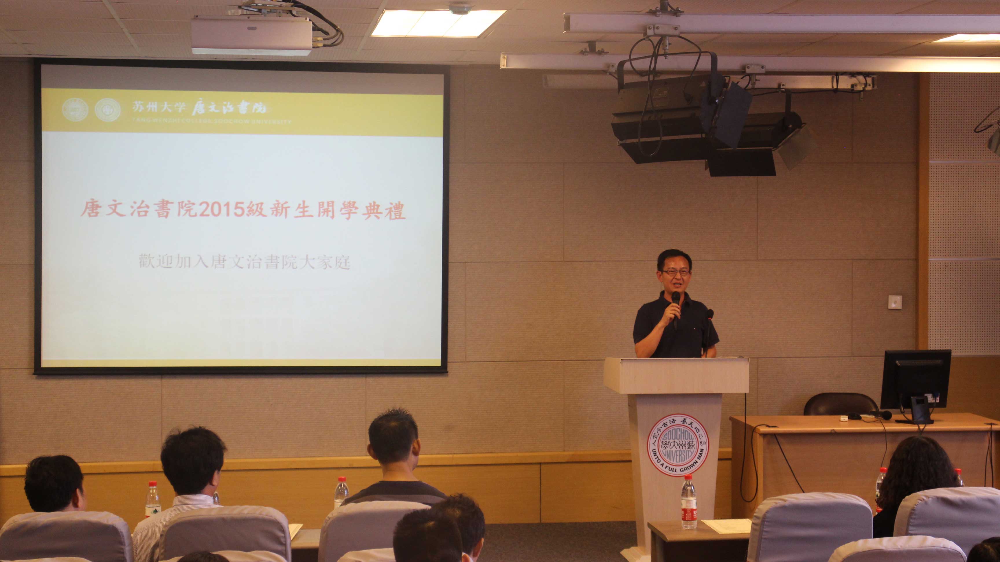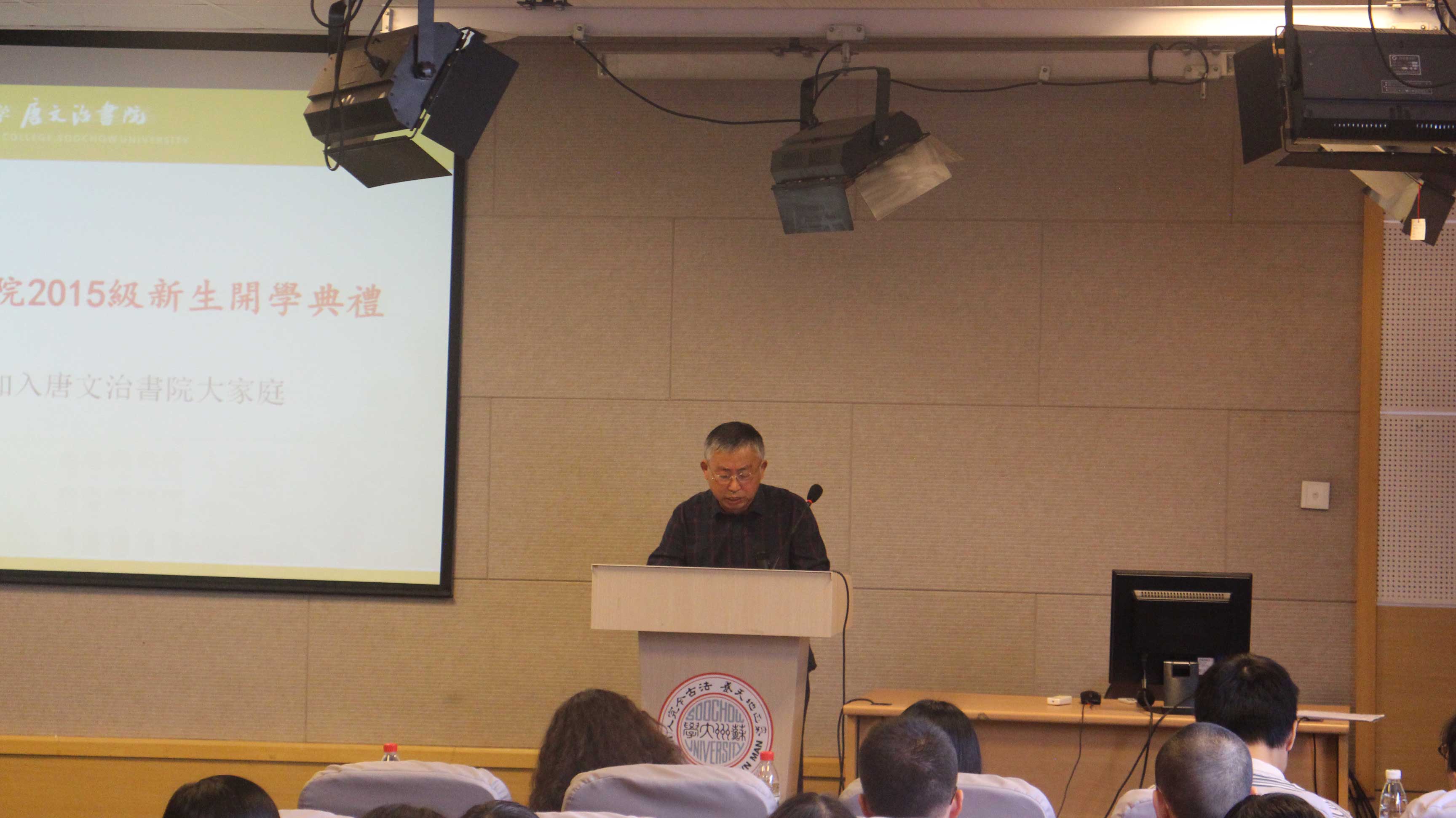 随着同学们热烈的掌声,唐文治书院常务副院长季进老师宣布唐文治书院2015级新生开学典礼正式开始。王尧院长首先代表书院领导讲话,代表文治书院热烈欢迎2015级新同学。王尧院长简单介绍了创办唐文治书院的目的和意义,展示了唐文治书院的“书院”特色以及书院提供的优质资源,简要阐述了唐文治书院“打通文史哲”的学习目标,并表达了对新生的欢迎与期望。接着,2012级杨潇潇作为老生代表进行发言,代表全体老生向新同学问好,和同学们分享在书院的学习和生活经历、经验,鼓励同学平时多自觉自主学习,欢迎新生怀抱着一种大人文精神的理想乌托邦精神来到书院。在老生分享完书院的学习、生活经验之后,新生代表2015级张煜棪进行发言,阐述了她选择苏州大学与唐文治书院的理由,提出了与同窗共勉成为基础扎实与人文情怀兼备的学者的希冀。之后,由导师代表赵杏根老师发言,他介绍了自己以及文治书院与唐文治先生的传承关系,介绍了文史哲成为特色专业的理由即承担了传承与发扬中国思想文化的社会使命,鼓励大家从文化批判、文化改造、文化创新与文化传承四个方面实现这个社会使命。