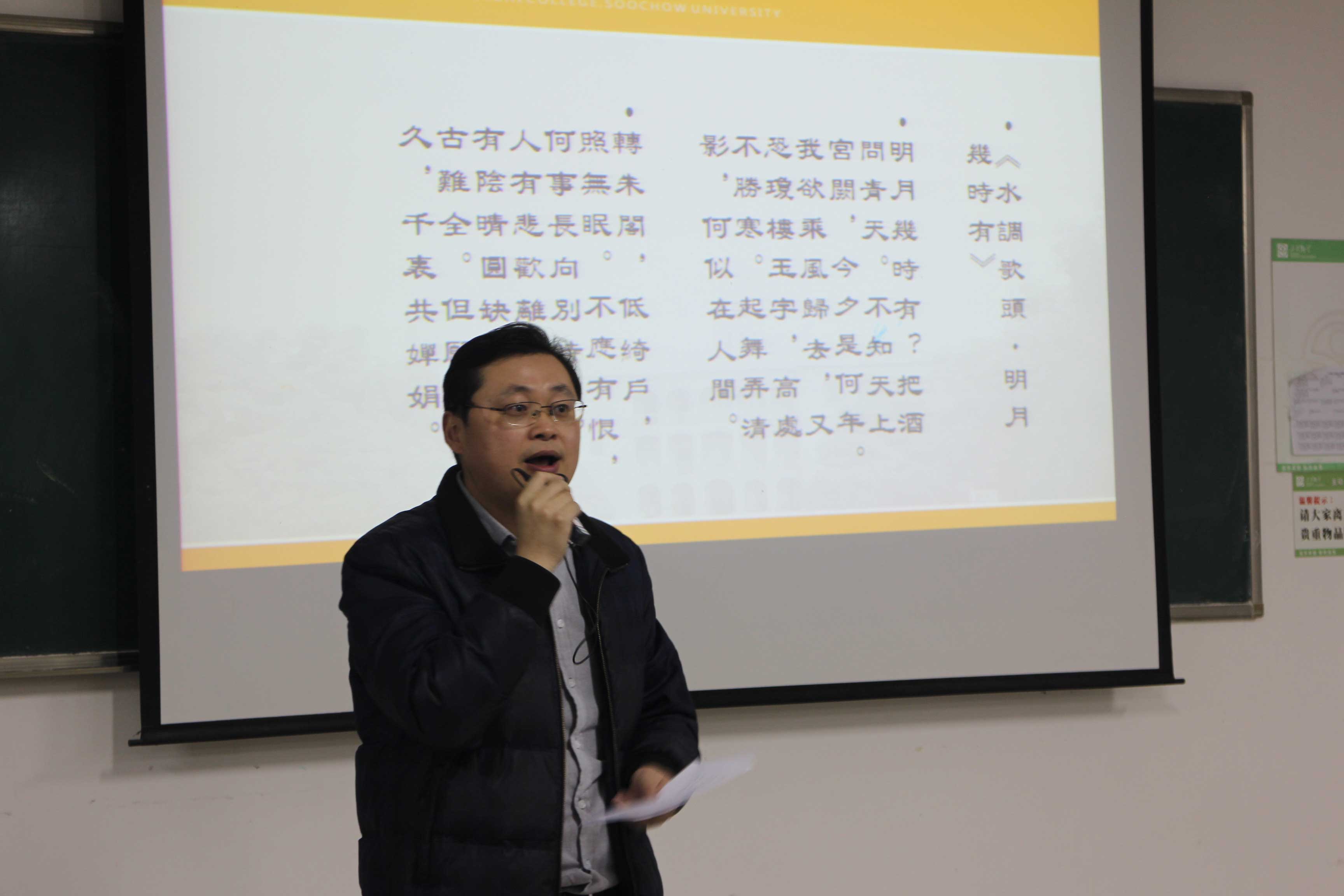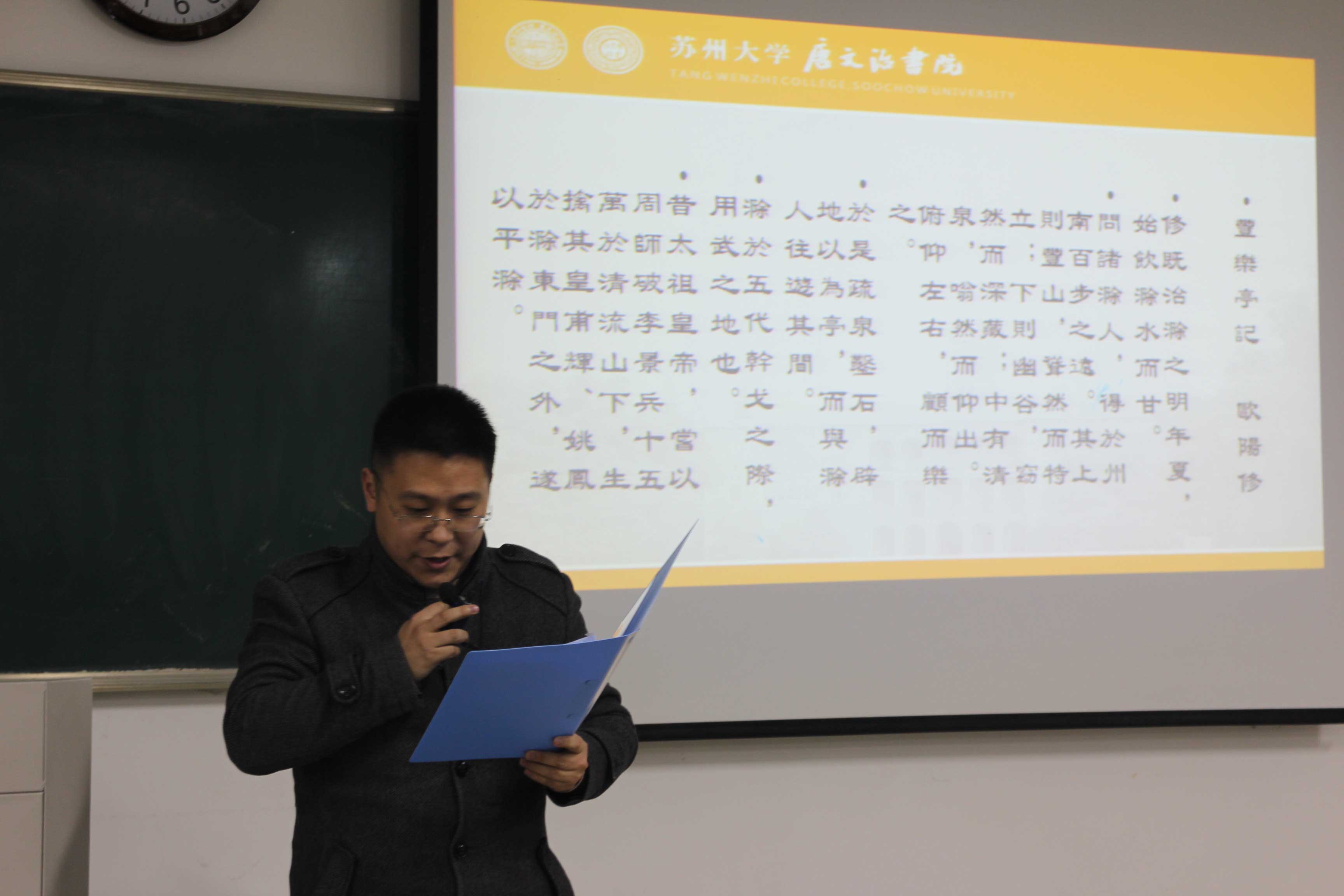 1216下午,苏州大学唐文治书院纪念唐文治先生诞辰150周年系列活动在独墅湖校区文综楼展开。本次活动有幸请到了中华诗词学会理事、江苏省诗词学会副会长、中华吟诵学会理事、苏州市沧浪吟诵总教习魏嘉瓒老师为大家带来《唐调的三个要素》的演讲。文学院、唐文治书院党委副书记张健老师,政治与公共管理学院哲学系副教授朱光磊老师,文学院教授钱锡生老师,海外教育学院顾闻钟老师,唐文治书院胡月华老师、李明铭老师,以及书院全体学生出席了本次活动。