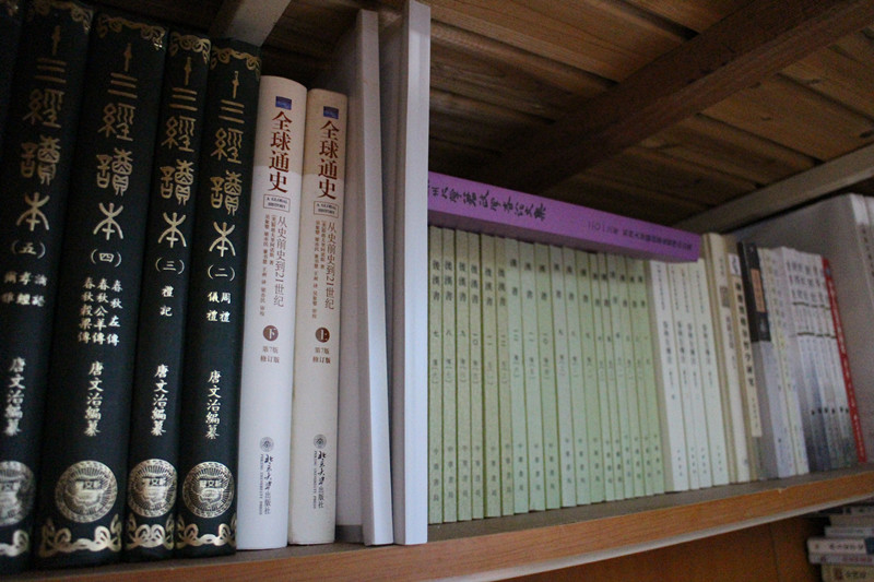 接着,评审团一行又来到了B06幢宿舍楼4个参赛的男生宿舍。男生宿舍文化布置又是另一番风景。如果说书院文化是一棵成长中的树,女生是她缤纷的叶子与花朵,男生定是枝干,纵使外表不如此艳丽,但内里却以最朴实的方式记录文治人成长的一圈圈年轮。男生宿舍没有太多复杂的装饰,它们的色彩是书桌上一盆文竹,是书架上厚薄各异的书皮。墙上一副毛笔字,门边架着一把古琴,简单大气,墨香书香。其中B02-226的书架上一套唐文治先生编纂的《十三经注疏》吸引了大家的兴趣,书海浩浩,纵使身处灯红酒绿深处,也不忘静下来翻一翻子史经集,才是文治人应有的品性。