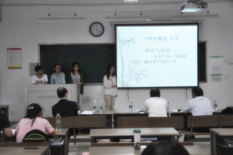 与此同时,在隔壁2304教室中,另外12组选手也在紧锣密鼓地进行着读书报告。第一位上场的是吴家舒同学,她就《儿童的世纪》这本书,从儿童观念的产生为切入口介绍了年鉴派心态史学研究。第二位上场的是金宏和于思瑶团队,她们针对《士与中国文化》一书,详细论述了关于士人的抉择的问题,并在老师点评环节中与朱光磊老师就“士与道”的问题进行了讨论。接下来杨安然同学就《老子道德经校释》一书集中探讨了“美恶之辩何为自然”的问题。她从老子原文和王弼对其的注文入手,深入阐释了老子对于美恶同根,皆和与自然的观点,并生动形象的借用比喻,进一步阐述了对于美恶我们应有的态度。接下来张彩虹和郝云飞同学依次做出了精彩的报告。随后刘佳凯同学以“深入浅出,导夫先路——浅析《汉书艺文志》中道家思想渊源”为主题做出报告,不仅对《汉书艺文志》中考镜道家思想之源流做出了阐发,并且介绍了《艺文志》中目录学之意义作用,及他在历史长河中的影响。七号是来自2013级的段鹏飞,就钱穆先生的《八十忆双亲师友杂忆》论述了《治学亦可兼济天下》的问题,并和评委老师探讨了关于读书与做官的命题。第八个上场的是2013级的潘伟峰,他从《清代地方政府》这本书出发讨论了清代行政体制的僵化及其对当下“简政放权”的现实启示。他深入浅出的讨论和翔实的论述也赢得了在场老师的肯定。随后,王小羽、花晓雅、刘畅、谢昌盛及马雪妍团队也分别上台完成了各自的读书报告。台下的老师们也针对大家论述过程中的舛误和不当之处提出了改进意见,对报告中的精彩之处给予了充分的肯定。至此,2304教室12组同学的报告也已顺利完成。最后,朱建刚老师代表所有关注和支持此次读书会的老师为同学们的表现做了精彩的评论:“同学们能在短短的一个月时间里,既要兼顾学业,又能对于一本古今中外的名家著作通透领悟,同学们勤奋好学之精神、涉猎范围之广泛让我刮目相看。同时,做为你们的师长,我要提醒的大家要在读书的过程中须得保住自己的思想,要用批判的眼光去审视书上作者的见解,孟子曰:‘尽信书,不如无书’,冰冻三尺非一日之寒。希望大家再接再厉,从学术上的‘知之者’变成学术上的‘乐之者’”。