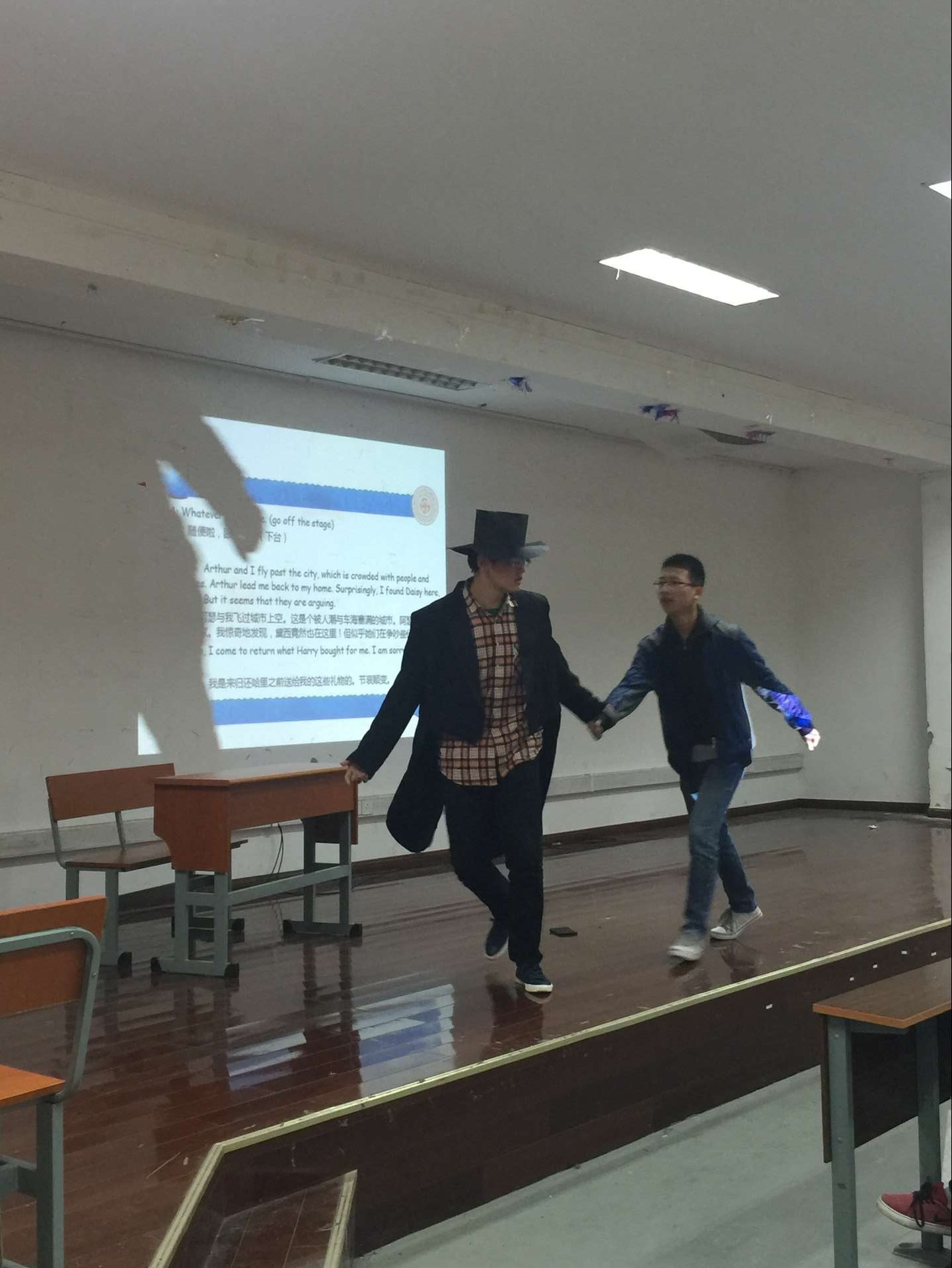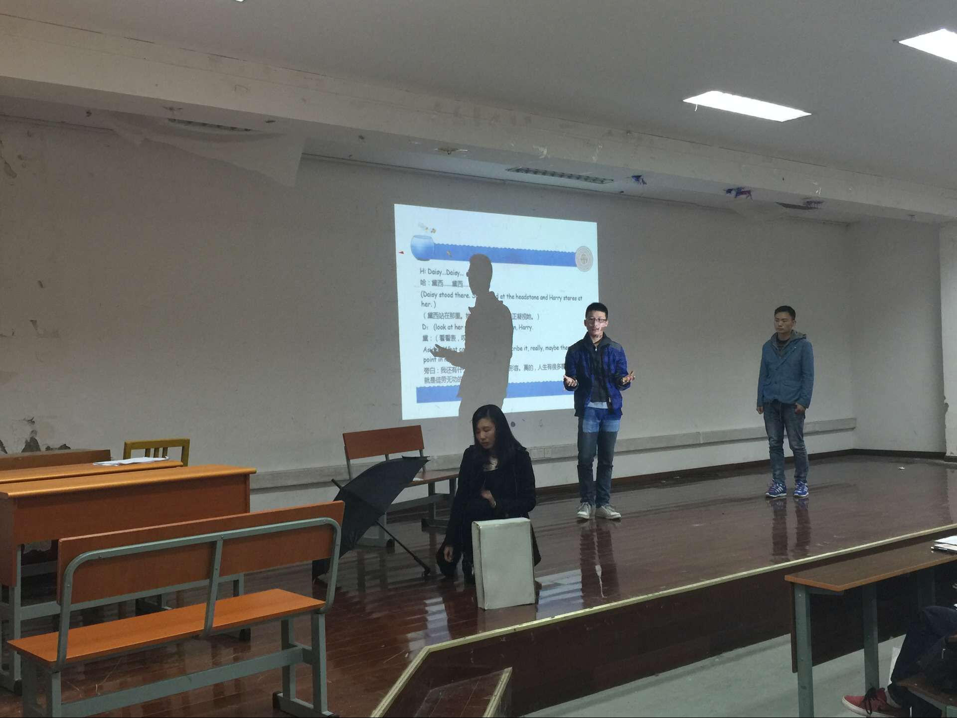 没有灯光,没有帷幕,没有话筒,简陋的设施打破了15级新生许多原有的设想。怎样切幕?如何转场?怎样让所有人都能听到?一个一个的问题并没有让他们退却。没有灯光,那么开灯关灯就是一幕与一幕的衔接;没有话筒,那么就发出充满感情的嘶吼……当姐姐持家的辛劳、死亡登记者的公事公办、游魂阿瑟的顽皮呆萌一一呈现,全场响起了经久不息的掌声。既是对演员出色表演的褒扬,更是对精心编剧的赞赏。