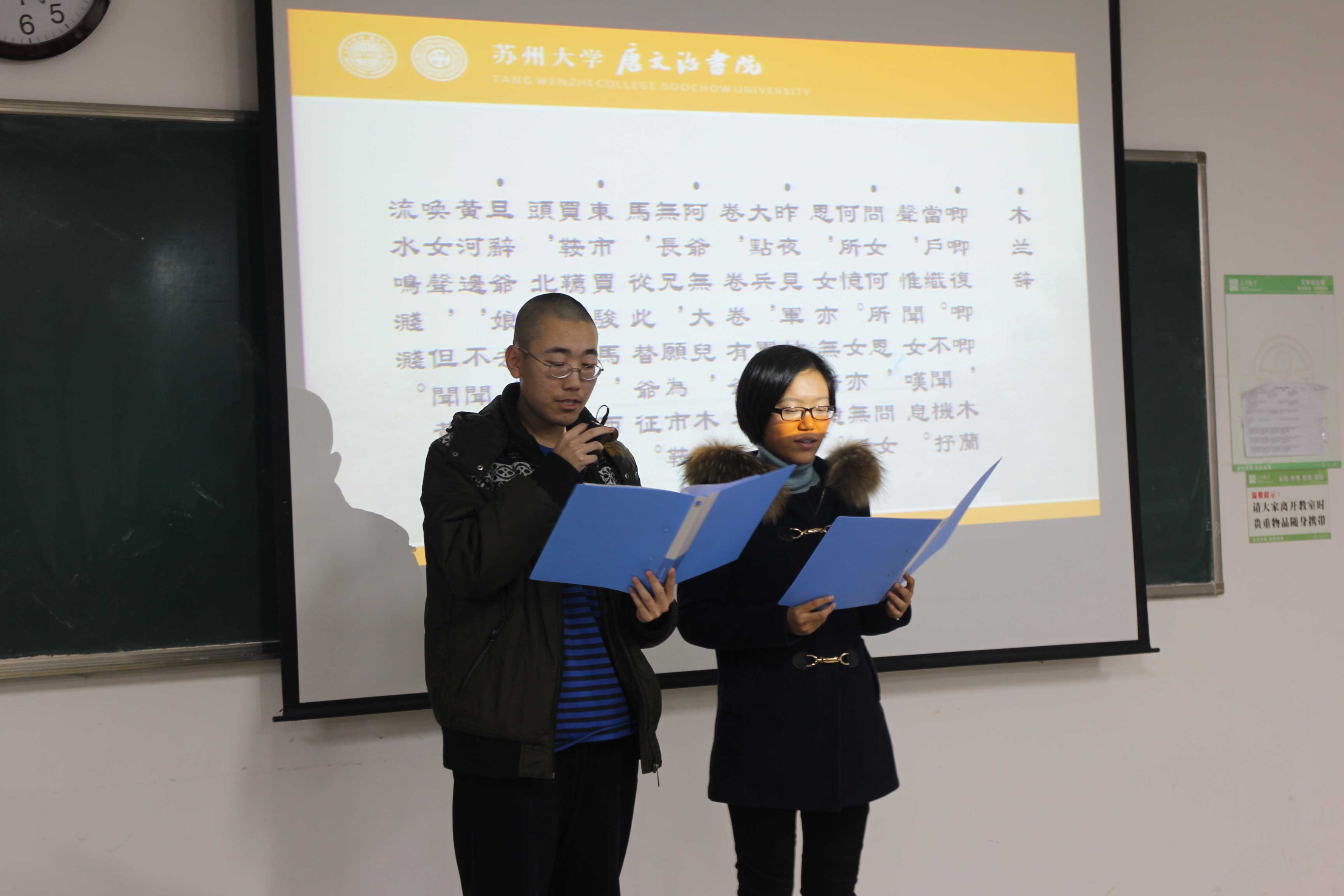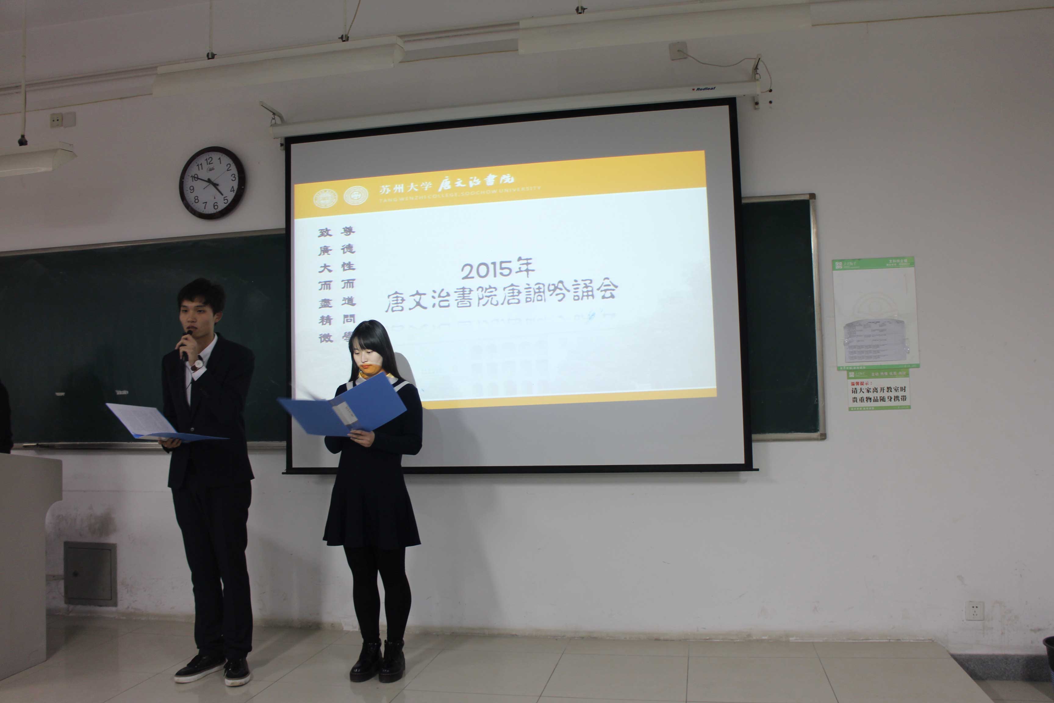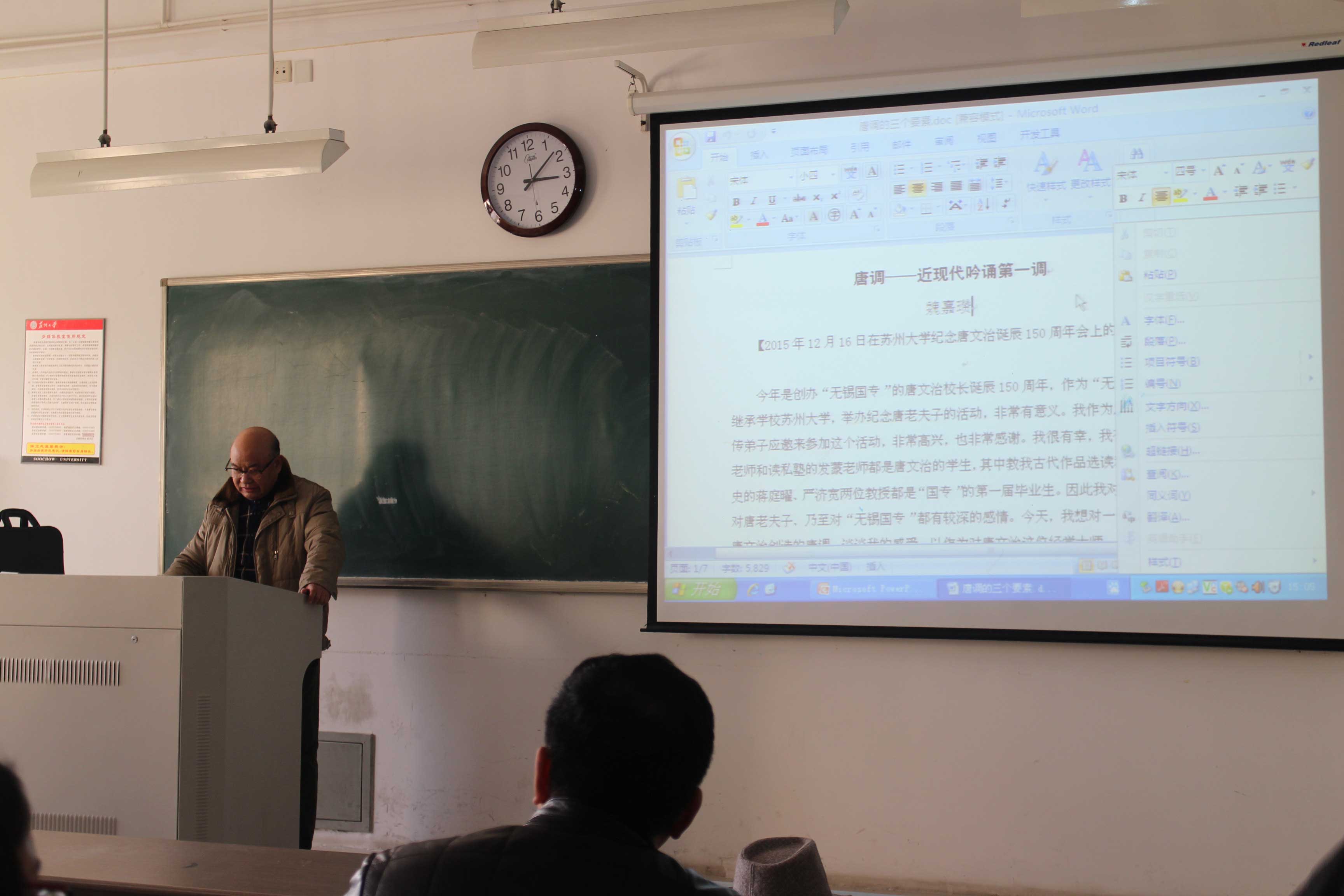 1216下午,苏州大学唐文治书院纪念唐文治先生诞辰150周年系列活动在独墅湖校区文综楼展开。本次活动有幸请到了中华诗词学会理事、江苏省诗词学会副会长、中华吟诵学会理事、苏州市沧浪吟诵总教习魏嘉瓒老师为大家带来《唐调的三个要素》的演讲。文学院、唐文治书院党委副书记张健老师,政治与公共管理学院哲学系副教授朱光磊老师,文学院教授钱锡生老师,海外教育学院顾闻钟老师,唐文治书院胡月华老师、李明铭老师,以及书院全体学生出席了本次活动。