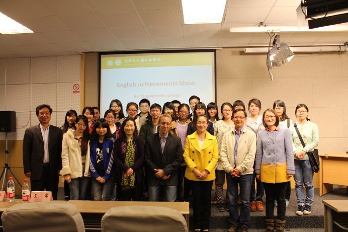 423日晚630,苏州大学唐文治书院首届英语教学改革成果展隆重拉开帷幕。本次成果展由文治书院全体学生倾力呈现,并邀请到众多校领导前来观摩。出席本次盛会的有外国语学院副院长孙倚娜,文学院、唐文治书院院长王尧,管理学院副院长车玉玲,唐文治书院副院长季进,外国语学院英文系主任王军,外国语学院教授Patrick Shelly,以及文治书院辅导员和各班班主任等。他们的到来让本次活动显得更为隆重,气氛也愈加热烈。