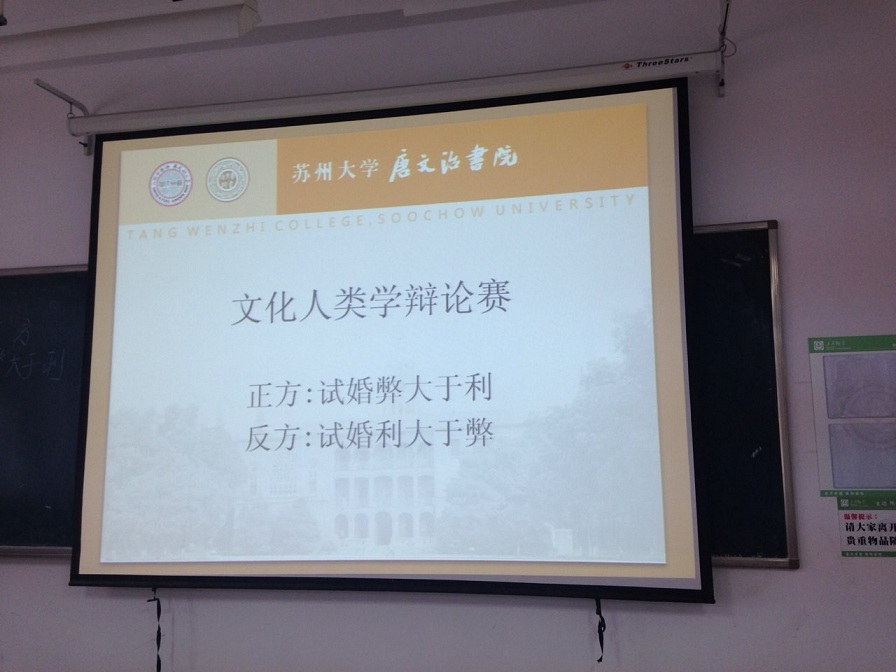 2014年5月19日,星期一,上午8:00至10:00,苏州大学2012级唐文治书院学生在“文化人类学”课程老师蒋慧的组织下,在文综楼1002#2302举办了一场以“试婚是否利大于弊”为主题的辩论赛。大家唇枪舌剑、激烈交锋,经过一番较量,最终以正方“试婚弊大于利”胜利而告终。