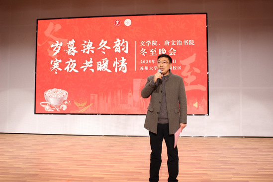 2025年12月17日晚六时三十分,“岁暮染冬韵,寒夜共暖情”——2025年文学院、唐文治书院冬至晚会在独墅湖校区文体中心多功能厅隆重举行。本次晚会由文学院与唐文治书院联合主办。文学院党委书记夏凤军老师,文学院、唐文治书院党委副书记、副院长纪金平老师,文学院院长助理裘兆远老师,2025级文学院班主任吕金刚、乔敏老师,文学院学生工作办公室主任吴杰老师,文学院团委书记陆亚桢老师,唐文治书院办公室主任薛羽婷老师,文学院团委副书记丁小珊老师,文学院留学生辅导员王占龙老师出席本次晚会。苏州大学校学生会代表、各兄弟院系学生会负责人以及文学院、唐文治书院各年级同学齐聚一堂,共赴这场冬日盛会。
