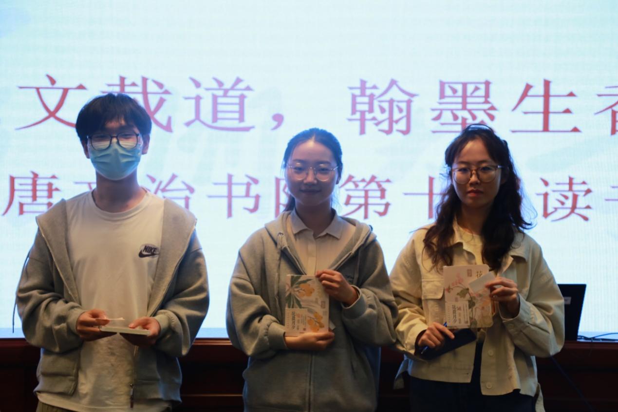 在后四个小组的段分享结束后,担任评委的高乐同学与钱佳琪同学对以上分享的内容作出了细致的点评,并对同学们认真的的态度和充实的分享内容的充实其所分享的内容给予了高度的肯定。随后,台下的幸运观众也收获了主办方发放的精美读书礼品。在读书分享会的最后,组委会为八组同学依次评分组委会为八组分享者一一评奖,获奖小组上台领奖并合影留念。至此,唐文治书院第十届读书会圆满落下帷幕。