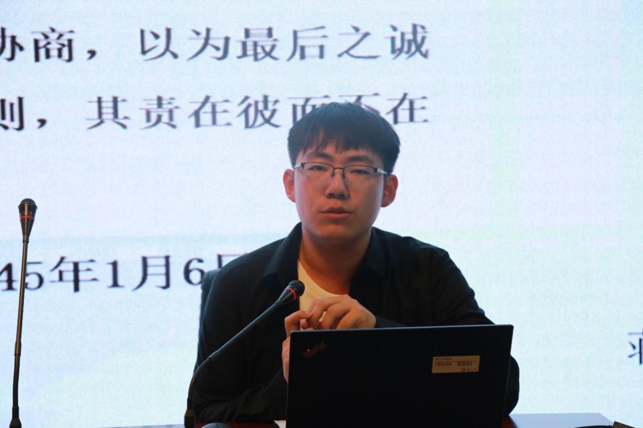 第四位进行汇报负责分享的曹印文同学就《联合政府与一党训政——1944~~ 1946年间国共政争》一书展开讨论。他以本书章节为脉络,在系统梳理各章的主要内容的基础上,也提出了自己的思考和见解。他认为,政治问题诉诸军事解决、,武力与政治问题 的高度统一,是近代中国的政治逻辑,也是历史的悲喜剧。本书也正围绕这一话题,借助第一手史料,客观地梳理了国民党、共产党和民盟以及介人入的美国和苏联等势力之间在利益瓜葛影响下的政治攻防过程,详细阐释了国共作出做出各自战略 决策的考量,一并说明了内战的最终爆发也与国民党内部派系林立的组织问题密不可分,而这最终也指向了近代中国的政治逻辑。于是,曹印文同学认为总结,抗日战争结束后国共提出和平建国,跳出历史规律的尝试的失败具有其必然性。