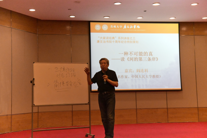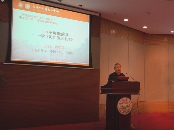 5月10日晚,在书院师生的热切期盼中,著名作家、中国人民大学教授阎连科教授受邀来到苏州大学,在炳麟图书馆学术报告厅为同学们带来了一场题为“一种不可能的真——读《河的第三条岸》”的讲座。